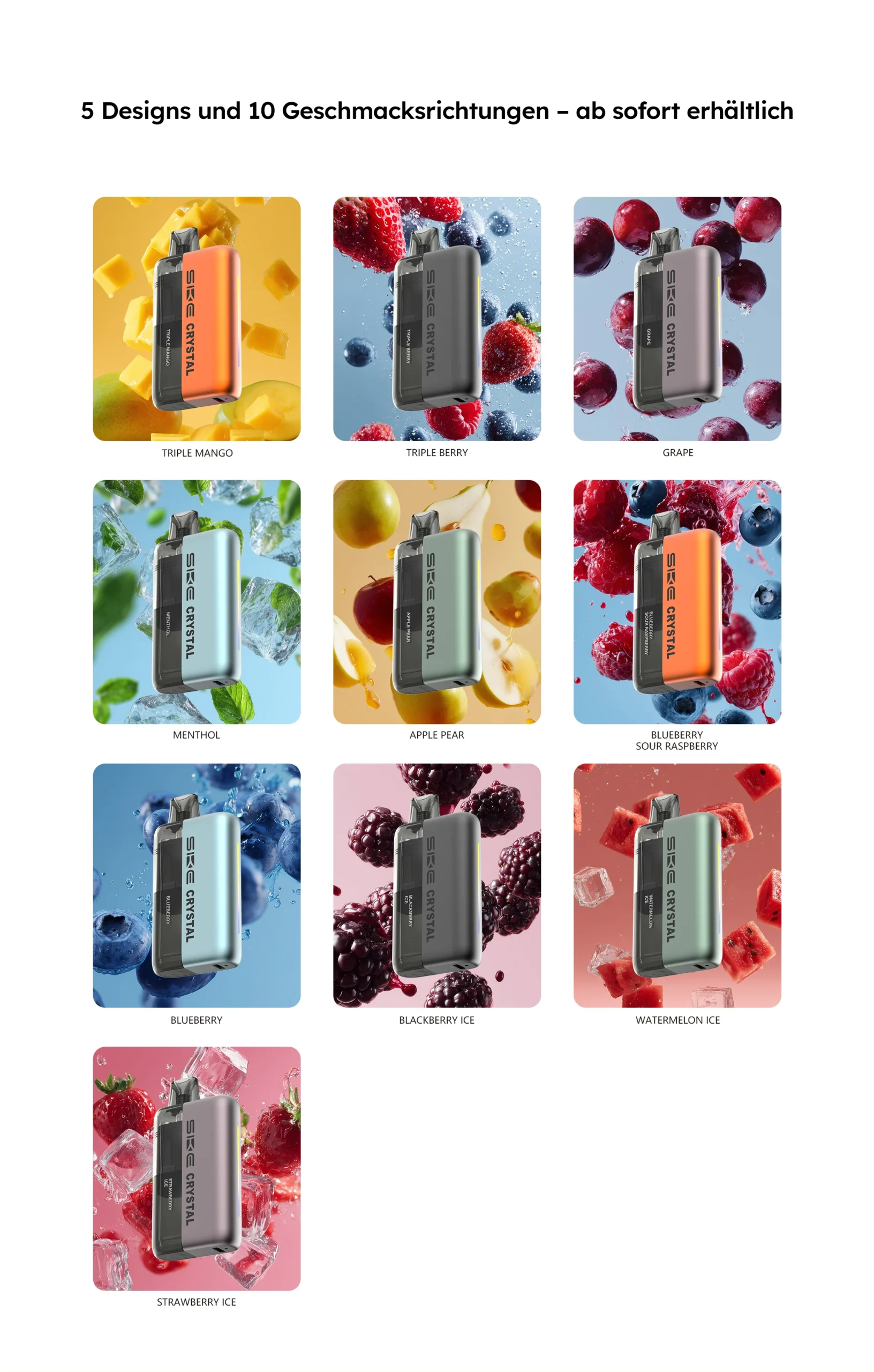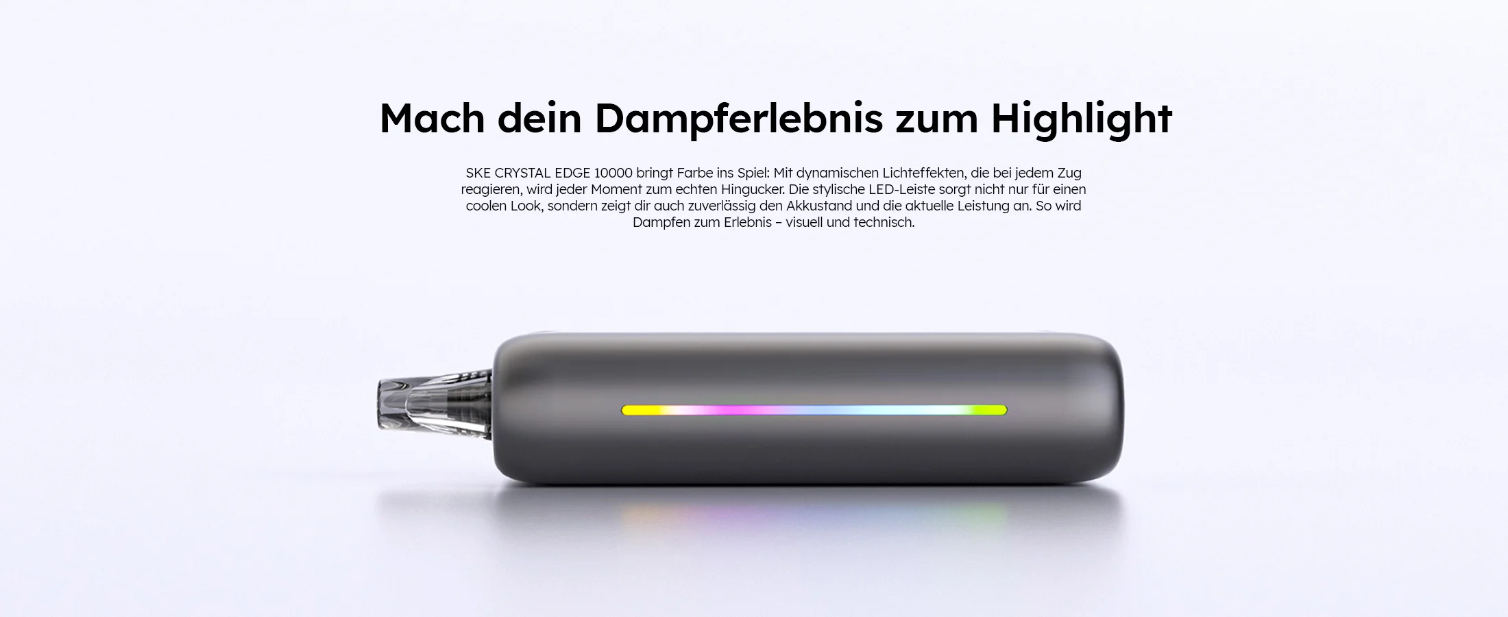 Das SKE Crystal EDGE 10000 überzeugt durch sein kristallklares, modernes Gehäuse, das sofort ins Auge fällt. Das Gerät ist kompakt, robust und angenehm in der Hand zu halten – ideal für den täglichen Gebrauch. Dank seines wiederbefüllbaren 2-ml-Pods und des 10-ml-Liquid-Containers vereint es den Komfort eines Disposables mit der Nachhaltigkeit eines wiederverwendbaren Systems.