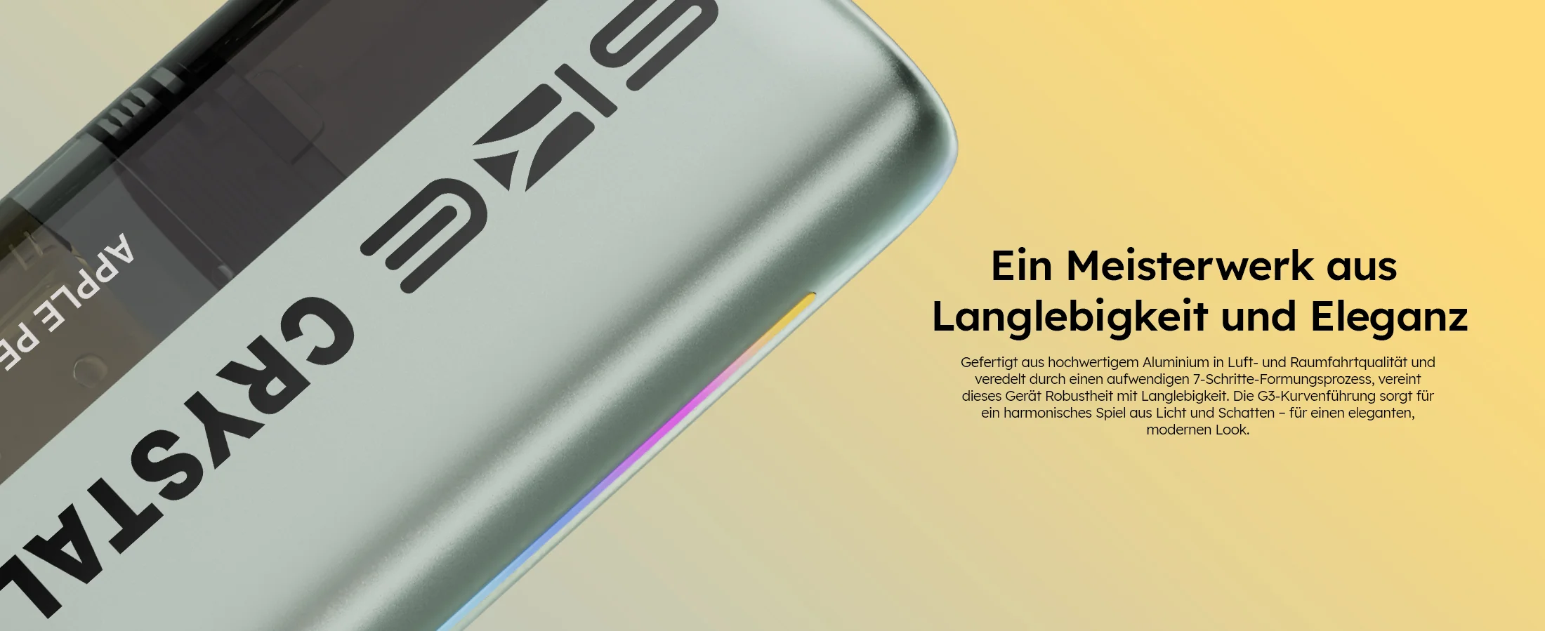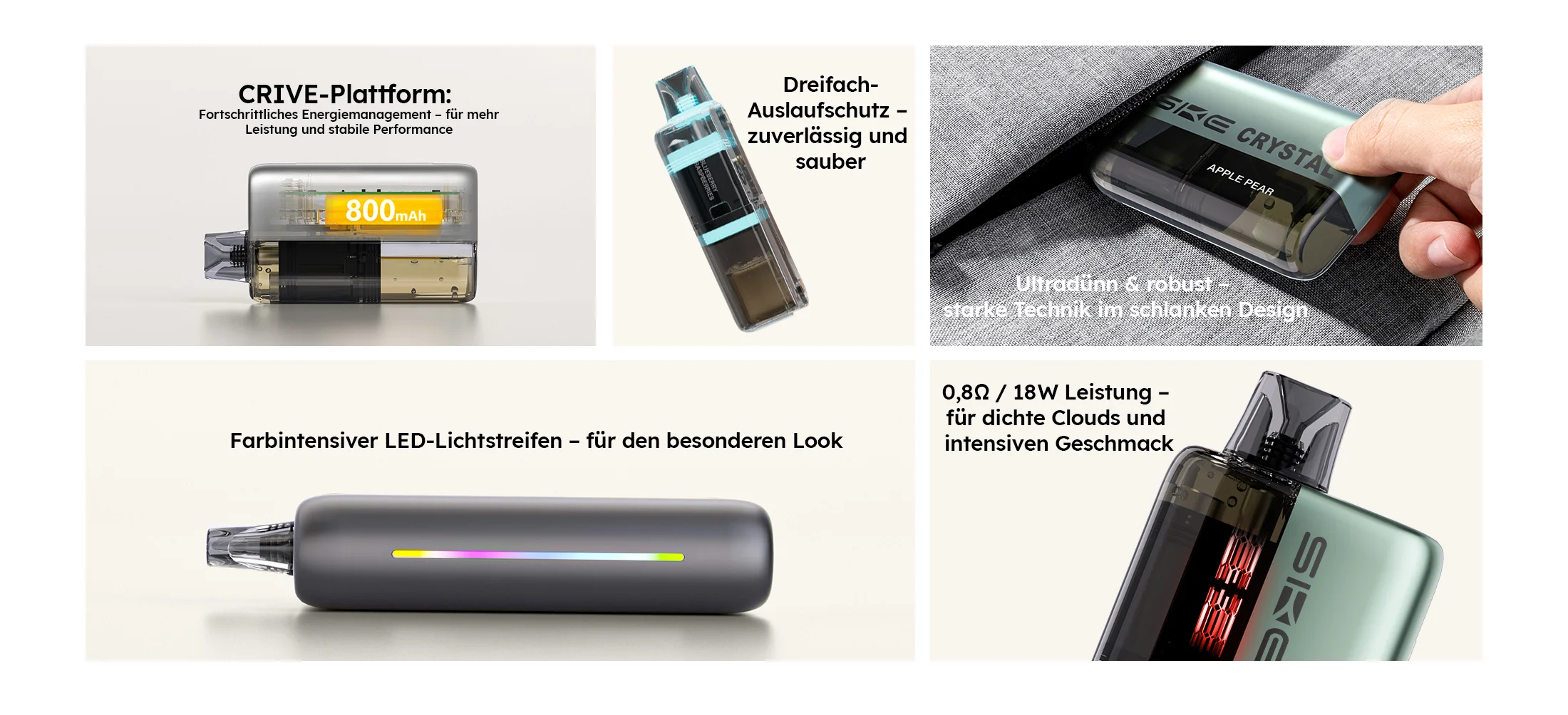 Der 800-mAh-Akku des Crystal EDGE ist auf Effizienz ausgelegt. In Kombination mit dem Type-C-Schnellladeanschluss kann das Gerät innerhalb kurzer Zeit wieder einsatzbereit gemacht werden. Der Akku hält je nach Zugverhalten problemlos einen ganzen Tag durch, was es zum idealen Begleiter für unterwegs macht.