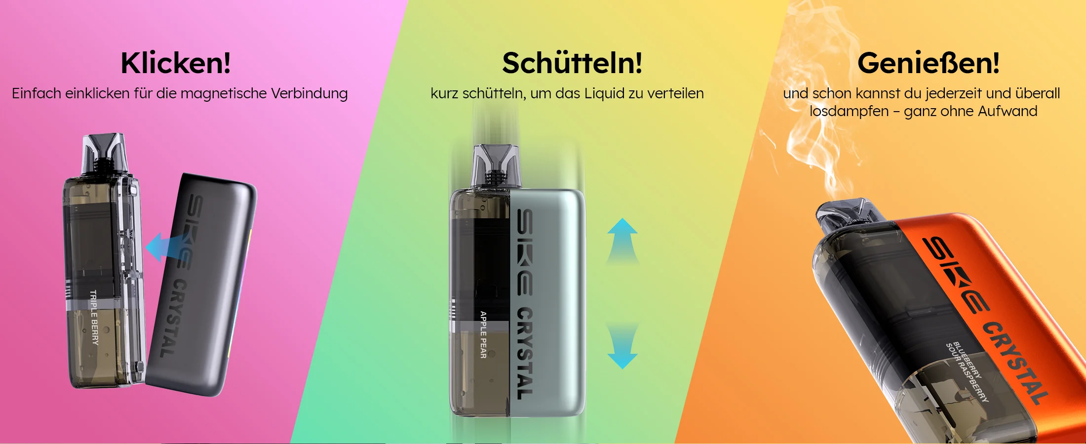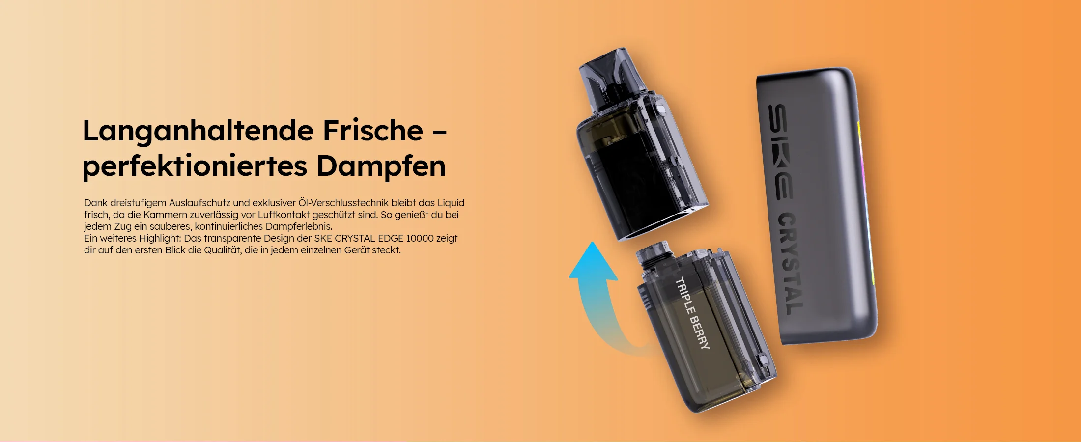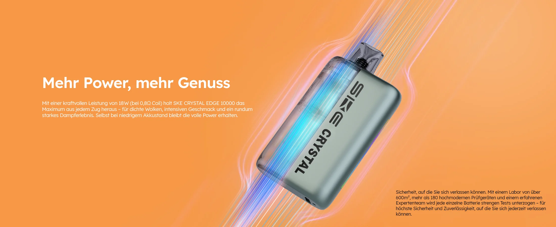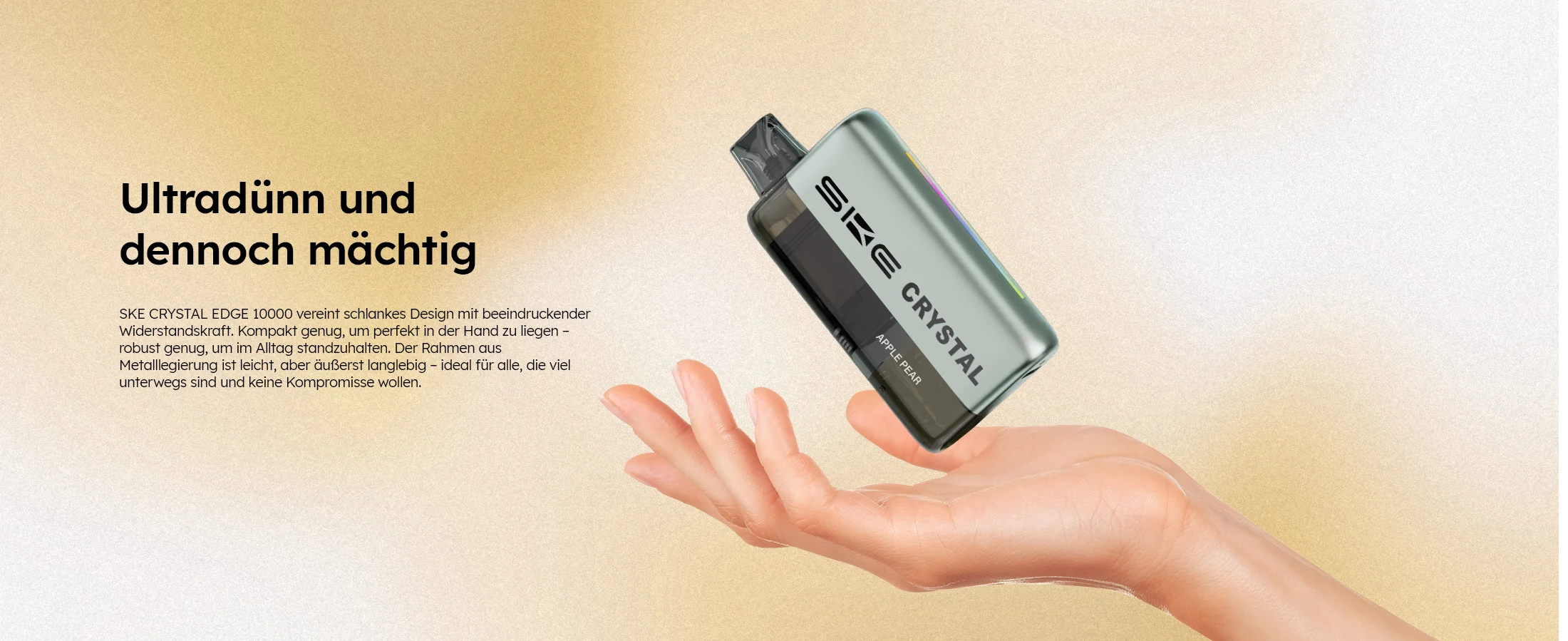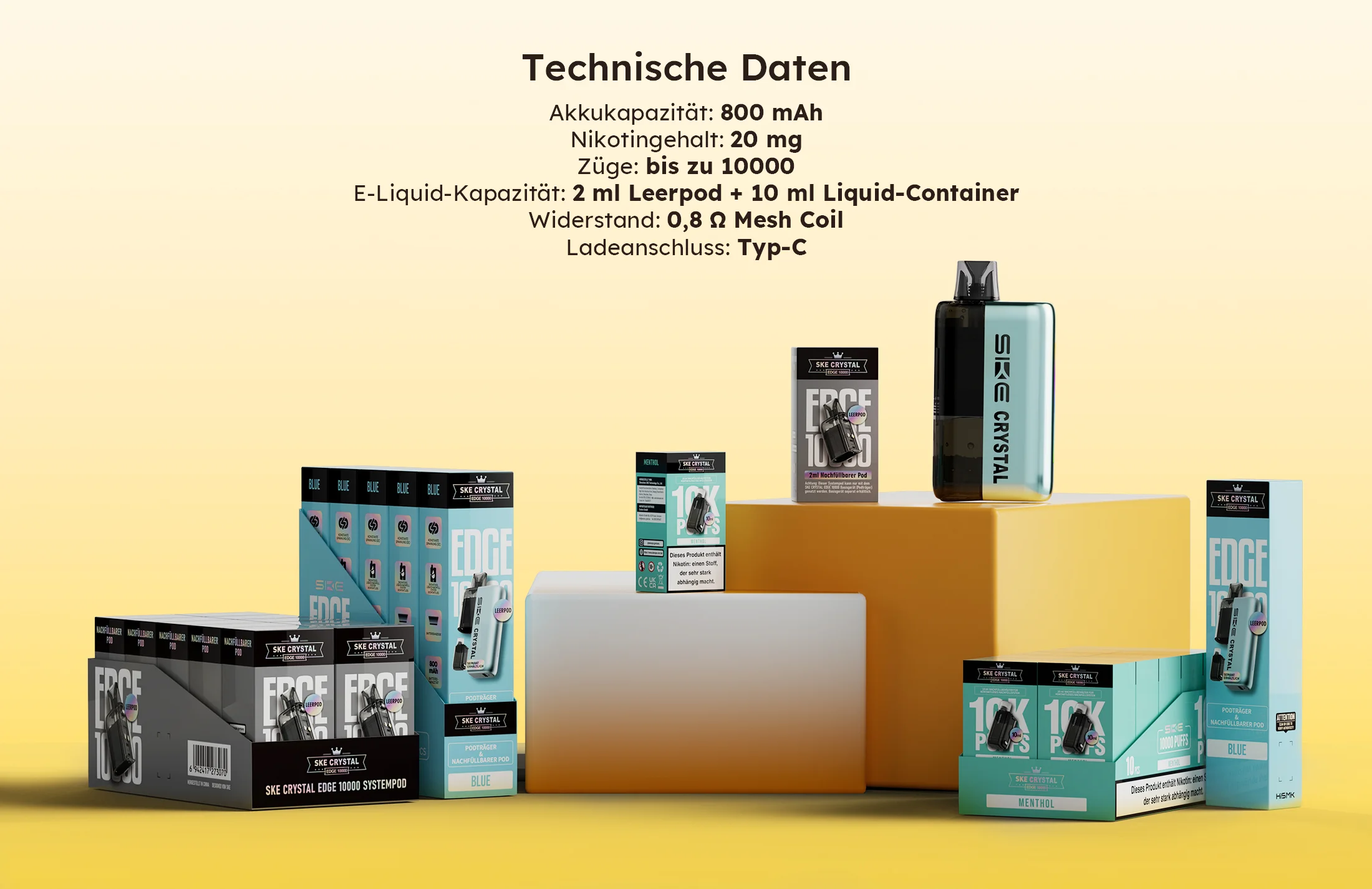 Das SKE Crystal EDGE 10000 Pod System setzt neue Maßstäbe im Bereich moderner Vaping-Technologie. Mit seiner hohen Zugkapazität, kraftvollen Mesh-Coil, großzügigen Liquidkapazität und schnellen Ladefunktion bietet es ein rundum überzeugendes Gesamtpaket. Ob du auf der Suche nach intensiven Geschmacksnoten, starker Nikotinabgabe oder nachhaltiger Nutzung bist – das SKE Crystal EDGE 10000 erfüllt alle Ansprüche und zeigt, dass Qualität und Innovation Hand in Hand gehen können.